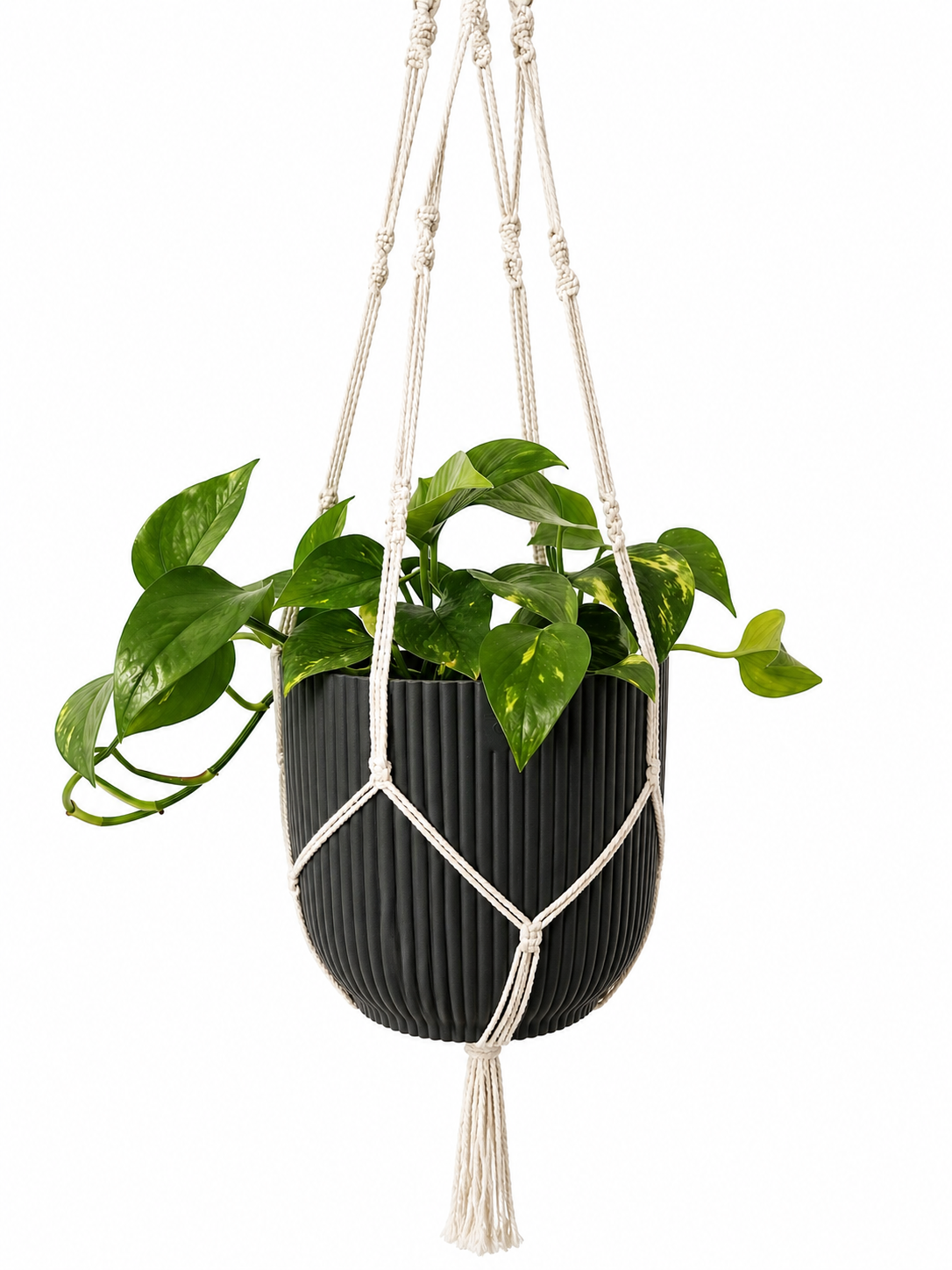 Totale lengte van de plantenhanger: circa 90 cm. Met een pot erin bedraagt de effectieve hanglengte ongeveer 85 cm.